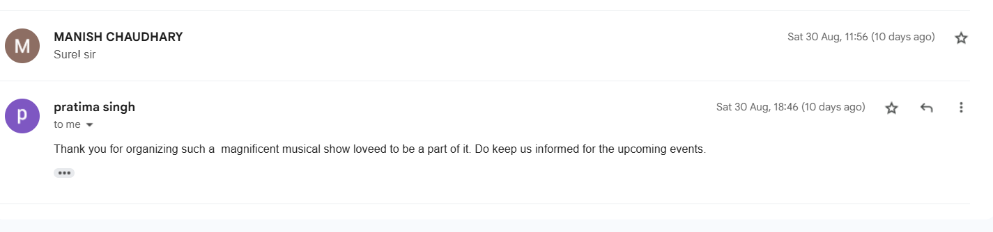 Thank you for organizing such a magnificent musical show loveed to be a part of it. Do keep us informed for the upcoming events.