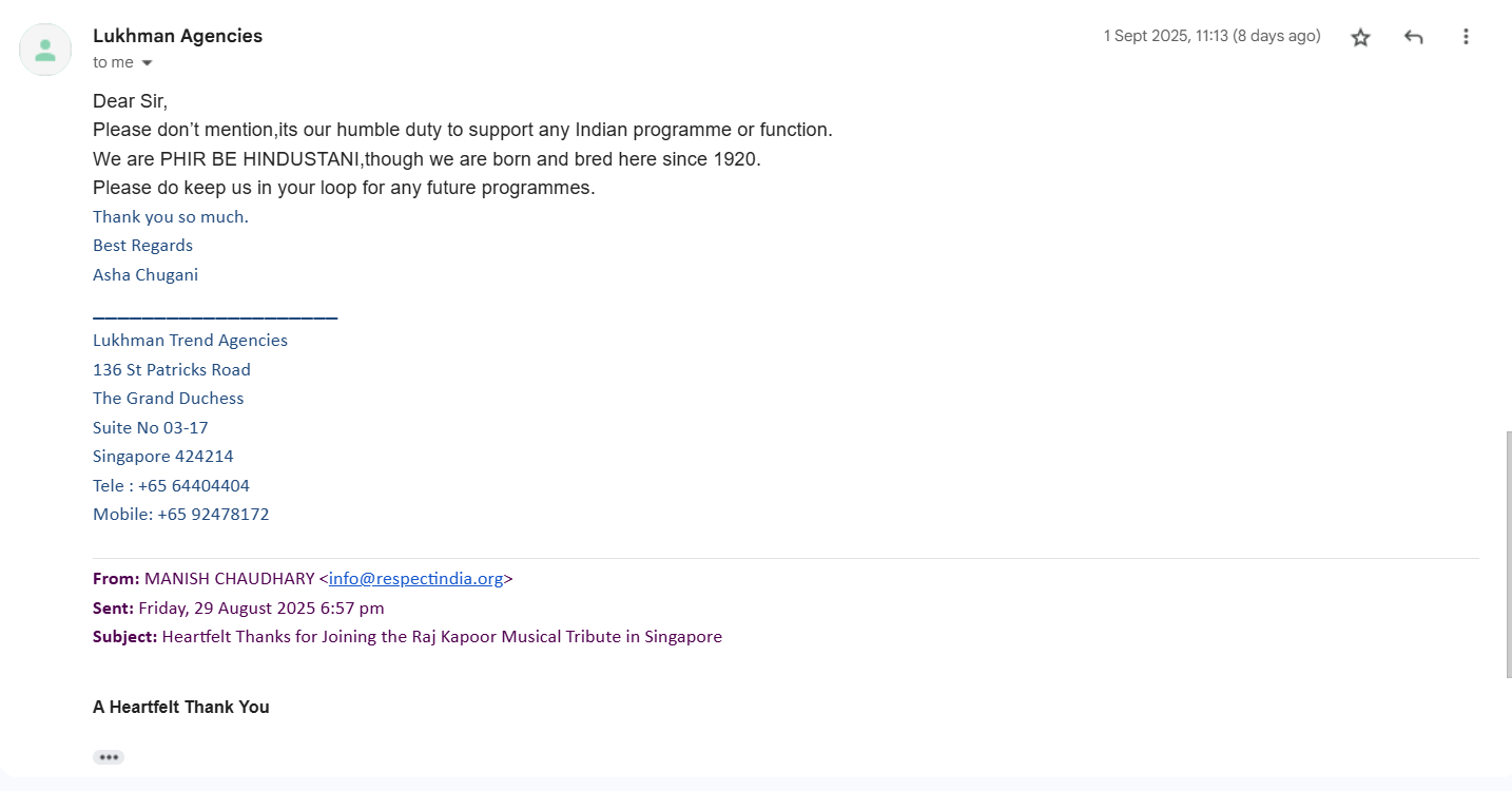 Its our humble duty to support any Indian programme or function. We are PHIR BE HINDUSTANI,though we are born and bred here since 1920. Please do keep us in your loop for any future programmes. Thank you so much.